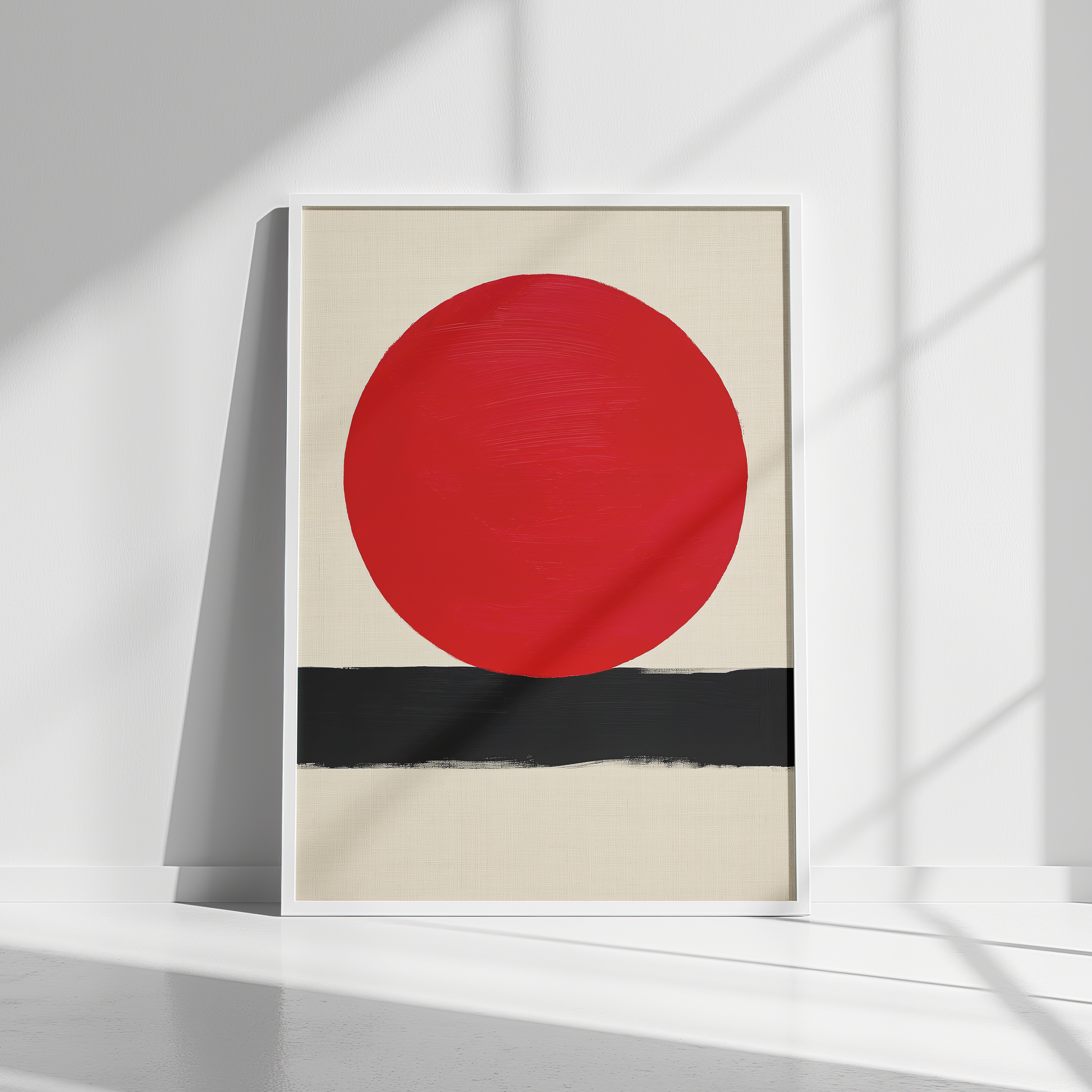 Striking in its simplicity, Solstice Balance embodies harmony through pure form and bold contrast. A vivid red circle radiates power and presence, anchored by a textured black horizontal bar that suggests stability, grounding, and balance. Set against a natural-toned canvas, the composition draws on timeless geometric language — evoking the sun at the horizon, a rising dawn, or an eternal cycle.